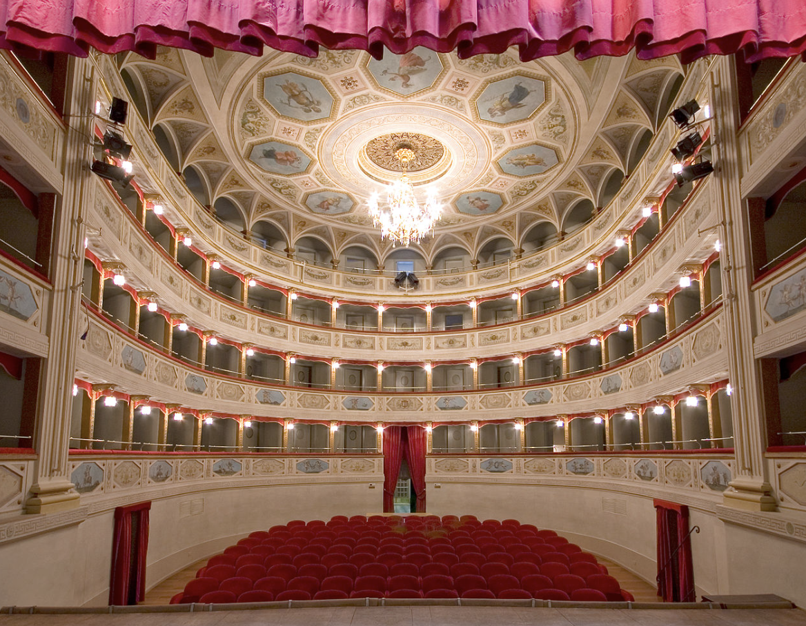 enuta meno l’antica Sala degli spettacoli con la demolizione del Palazzo Consolare a San Severino al Monte, la città rimane priva di una sala pubblica. Dopo un lungo dibattito in Consiglio comunale, iniziato nel 1732, alcuni rappresentanti dell’aristocrazia locale costituiscono un Condominio teatrale e raccolgono i fondi necessari per la costruzione di un teatro nella Piazza Maggiore, affidandone nel 1740 la progettazione all’architetto fanese Domenico Bianconi, che disegna una struttura in legno con pianta “a campana”, un ampio palcoscenico, tre ordini di palchi e un loggione con balconata a colonnine. Il Teatro de’ Condomini è ultimato ed inaugurato nel 1747. Nel 1823 la struttura in legno viene giudicata antiquata e insicura a causa del pericolo di incendi, per cui la Congregazione teatrale affida la progettazione di un nuovo teatro in muratura al giovane architetto locale Ireneo Aleandri (1795 – 1885), che ha studiato presso l’Accademia di San Luca a Roma sotto la guida dell’architetto neoclassico Raffaello Stern e che nello stesso anno ha ricevuto l’incarico per la progettazione dello Sferisterio di Macerata. Aleandri, pur limitato dall’esiguità dello spazio a disposizione, progetta una struttura elegante e slanciata verso l’alto, con pianta a ferro di cavallo, tre ordini di palchi e loggione, usando per la prima volta nel soffitto le “unghiature” bibianesche che costituiranno in seguito una cifra distintiva del suo stile architettonico teatrale.